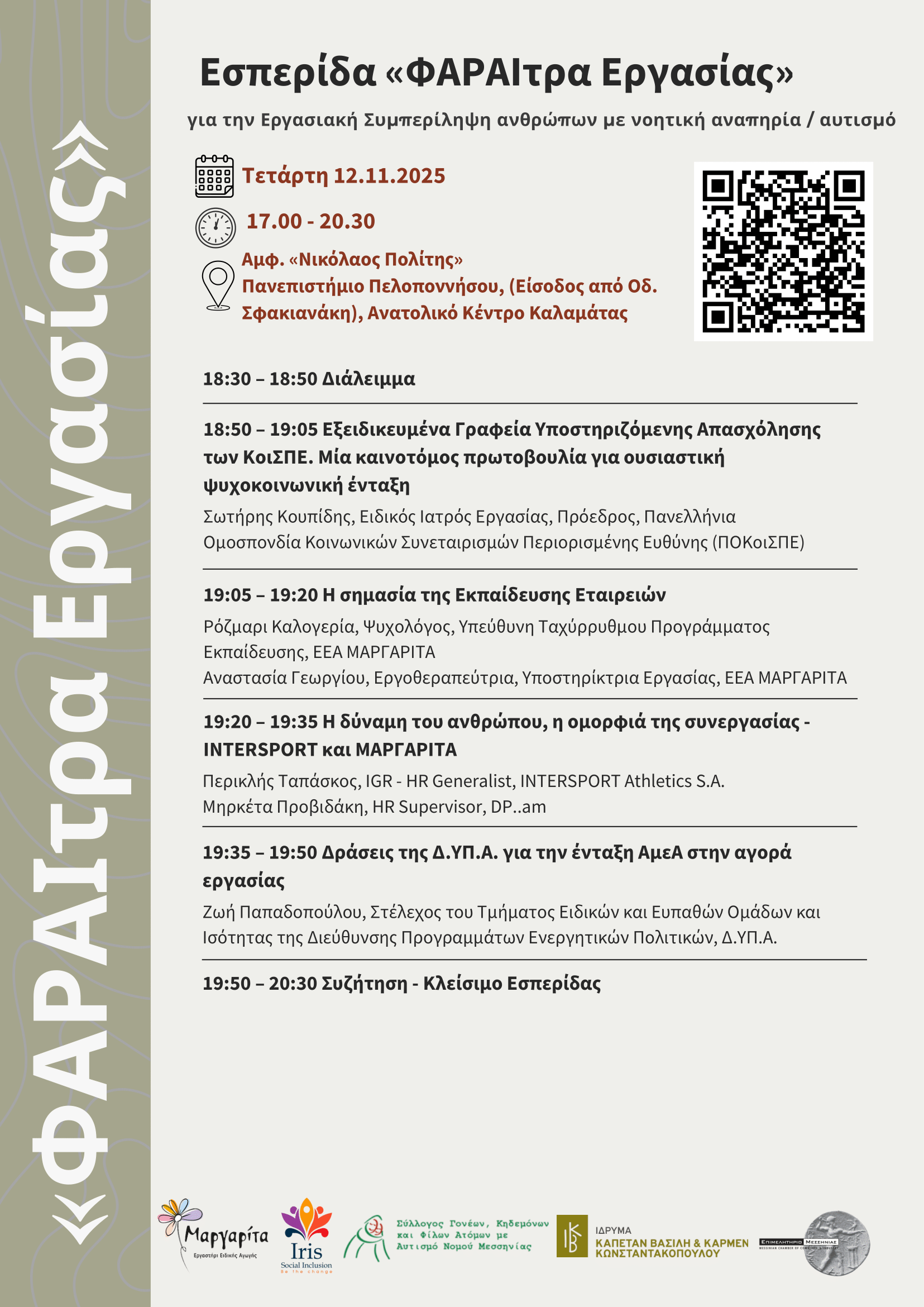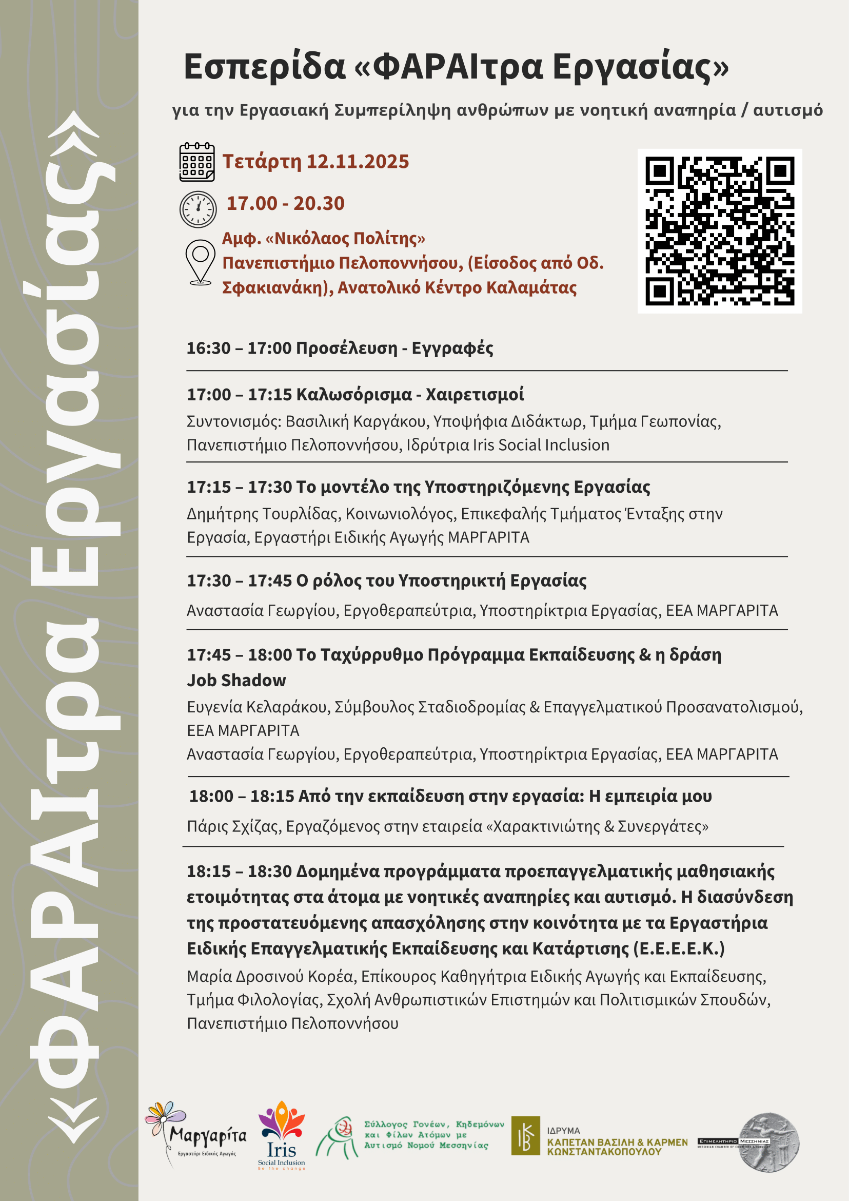 Την Τετάρτη 12 Νοεμβρίου 2025, από 17:00 έως 20:30, στο Αμφιθέατρο «Νικόλαος Πολίτης» του Πανεπιστημίου Πελοποννήσου (Είσοδος από Οδ. Σφακιανάκη), Ανατολικό Κέντρο Καλαμάτας, θα πραγματοποιηθεί εσπερίδα αφιερωμένη στην Υποστηριζόμενη Εργασία και τις προοπτικές εργασιακής συμπερίληψης των ανθρώπων με νοητική αναπηρία / αυτισμό. Η εσπερίδα είναι ανοιχτή στο κοινό και απευθύνεται σε εργοδότες, επαγγελματίες, στελέχη Οργανώσεων της Κοινωνίας των Πολιτών, οικογένειες και κάθε πολίτη που ενδιαφέρεται για την εργασιακή συμπερίληψη.